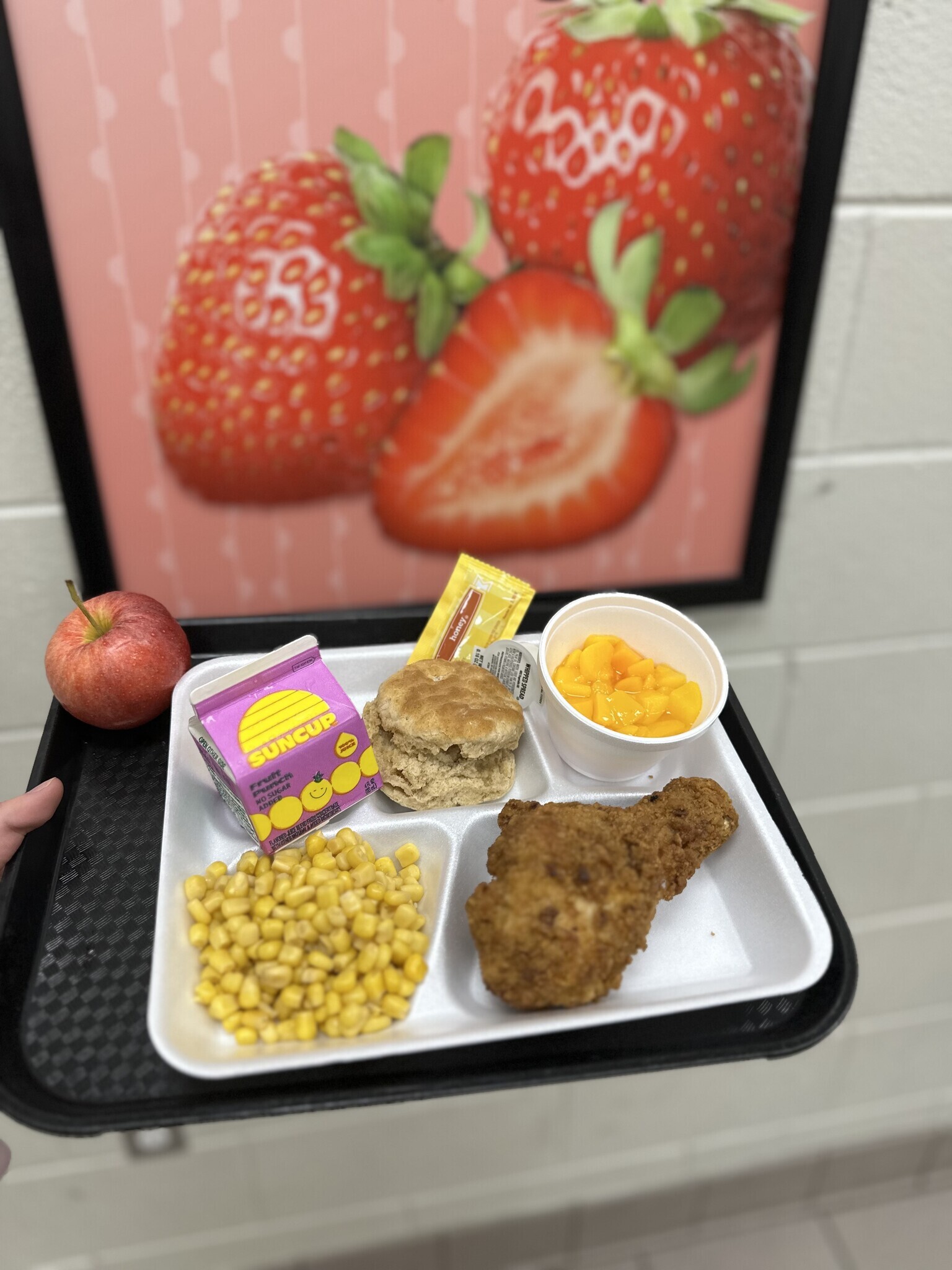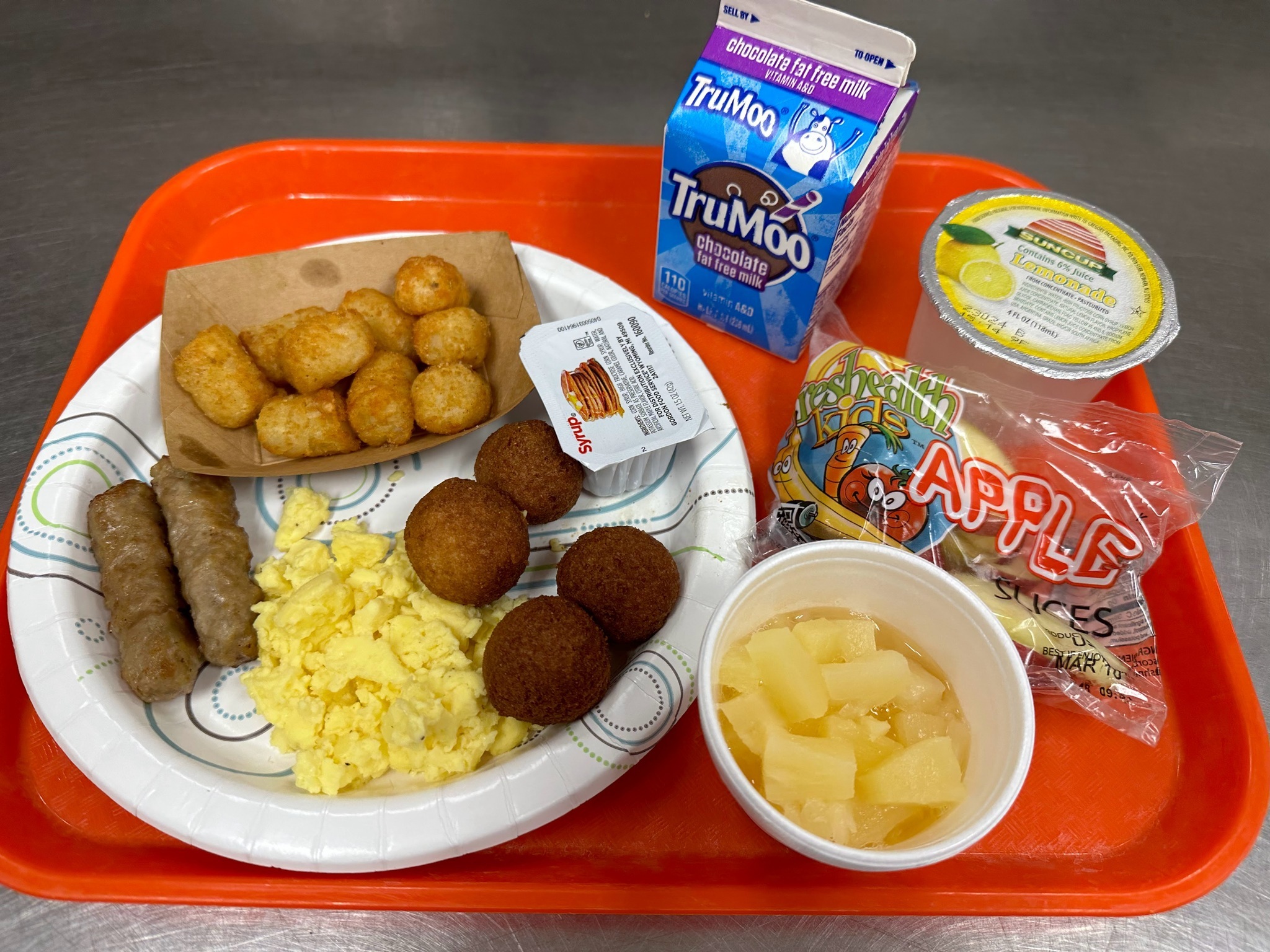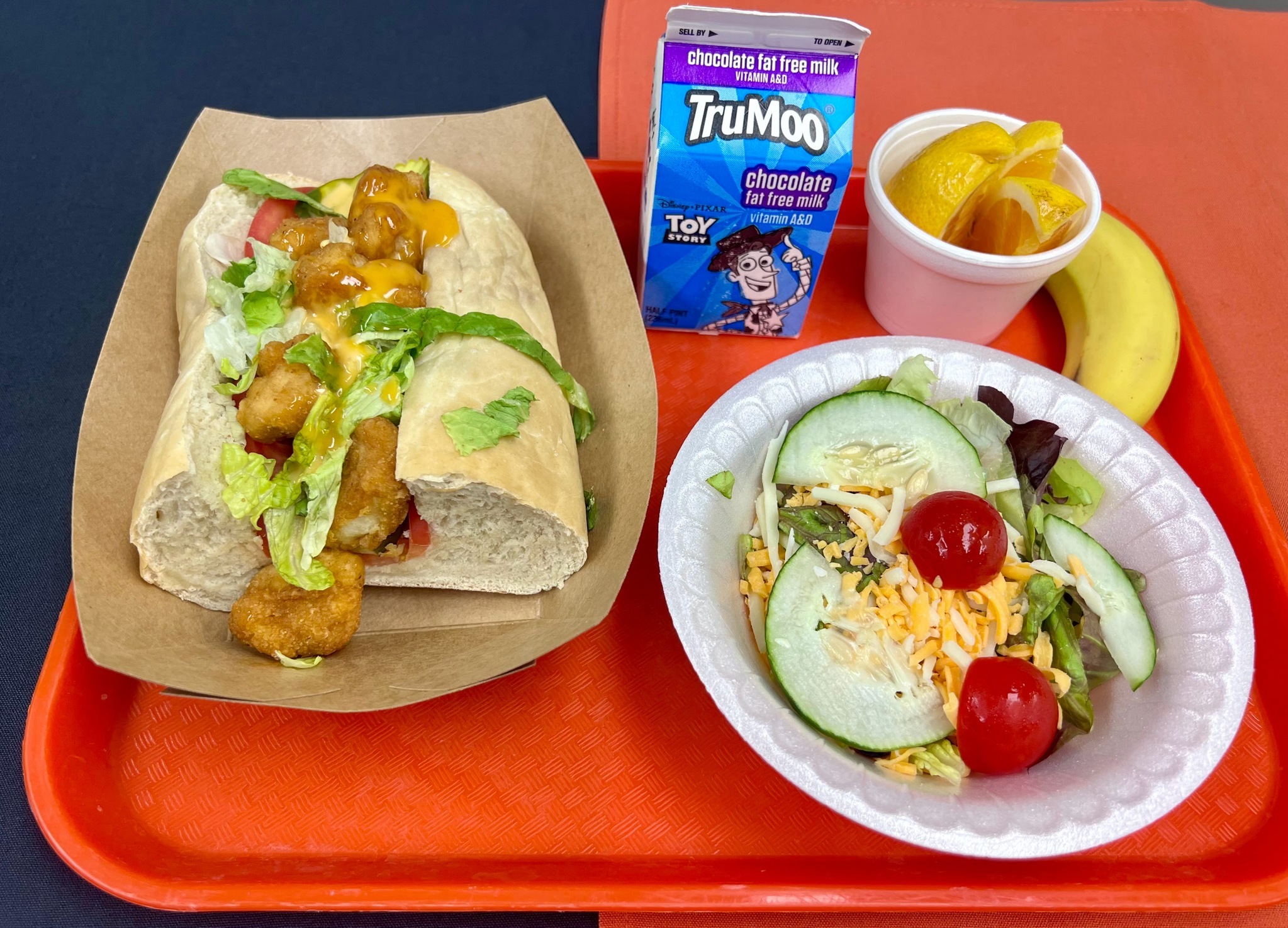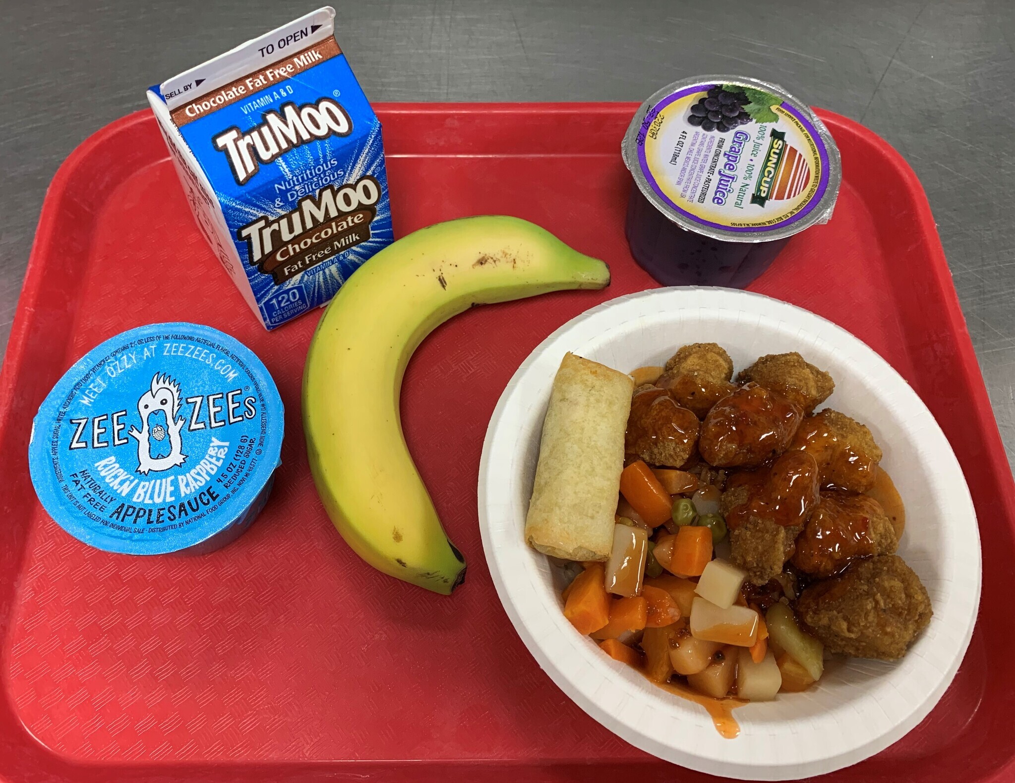 "Oriole" bowl with sweet and sour chicken, rice , veggies, sauce and an egg roll. Served with fruit, juice and milk. Good Lunch!!!