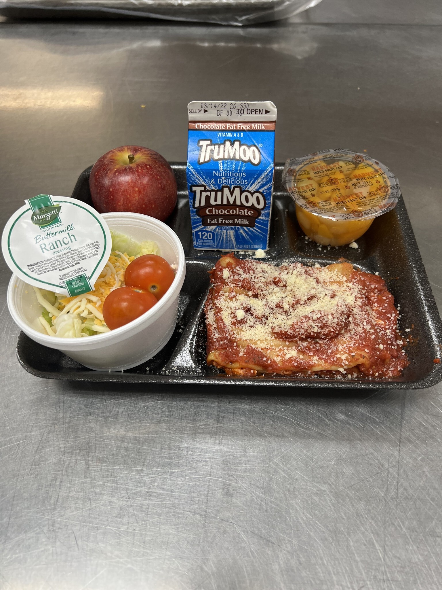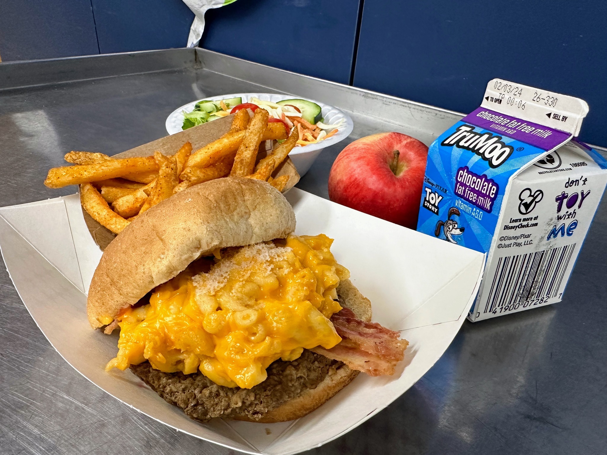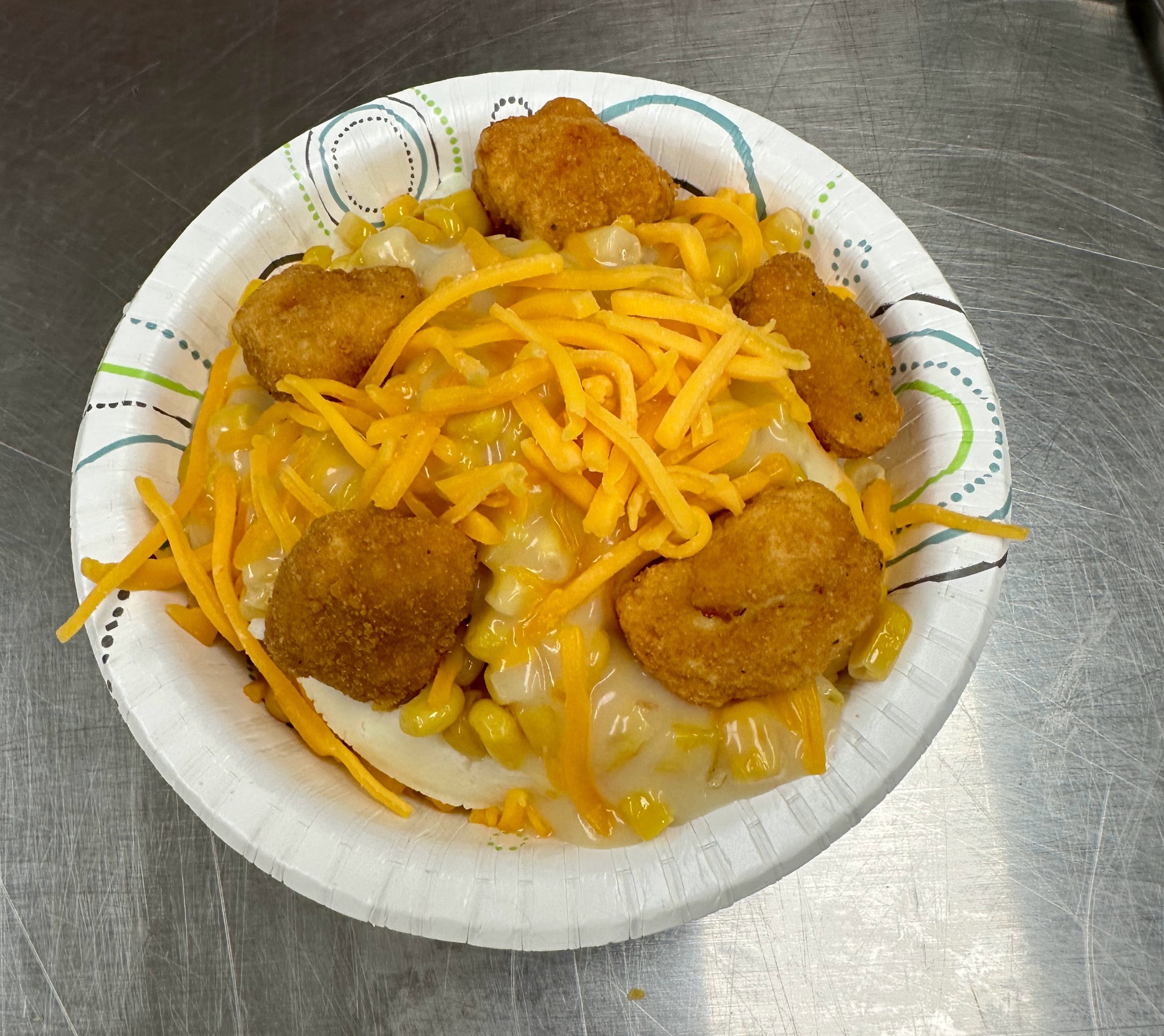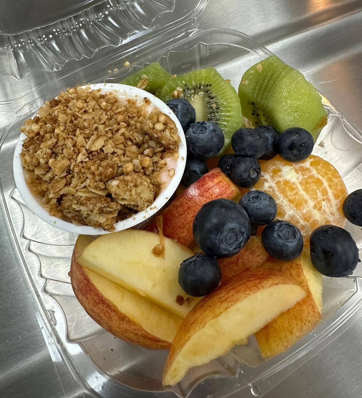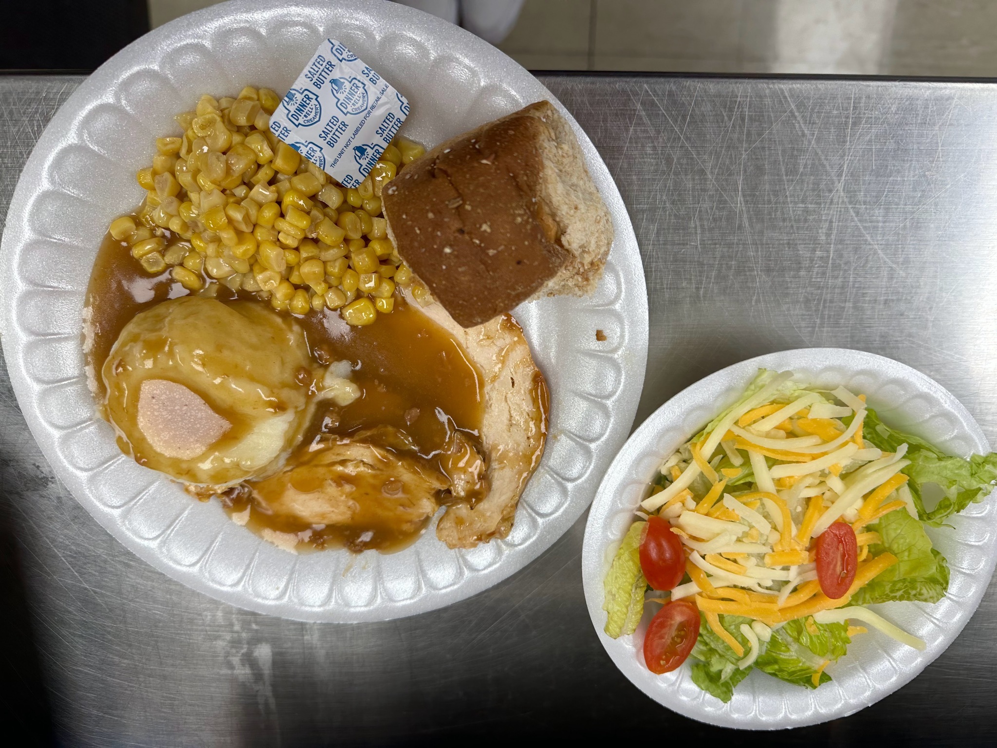 "Oriole" bowl with sweet and sour chicken, rice , veggies, sauce and an egg roll. Served with fruit, juice and milk. Good Lunch!!!