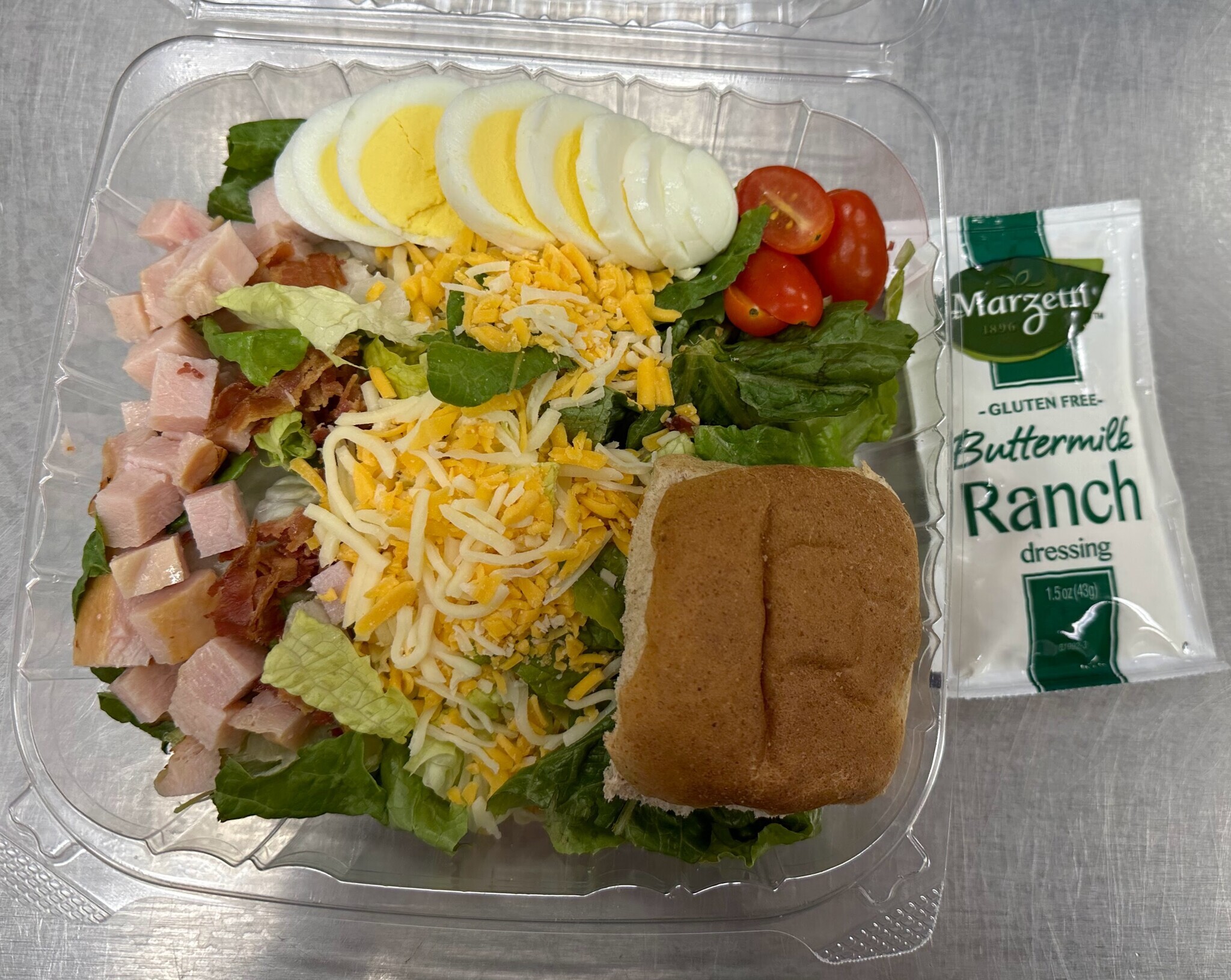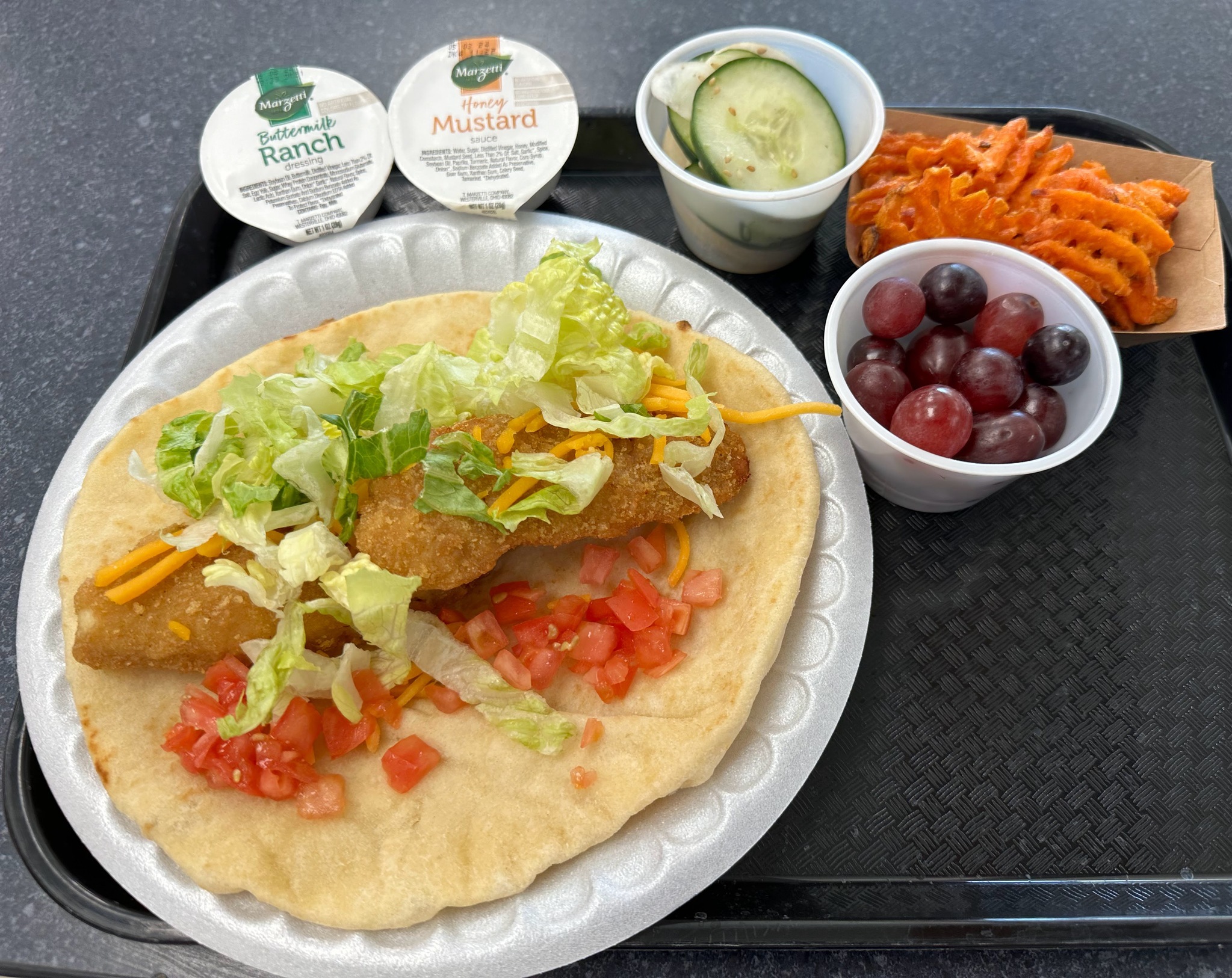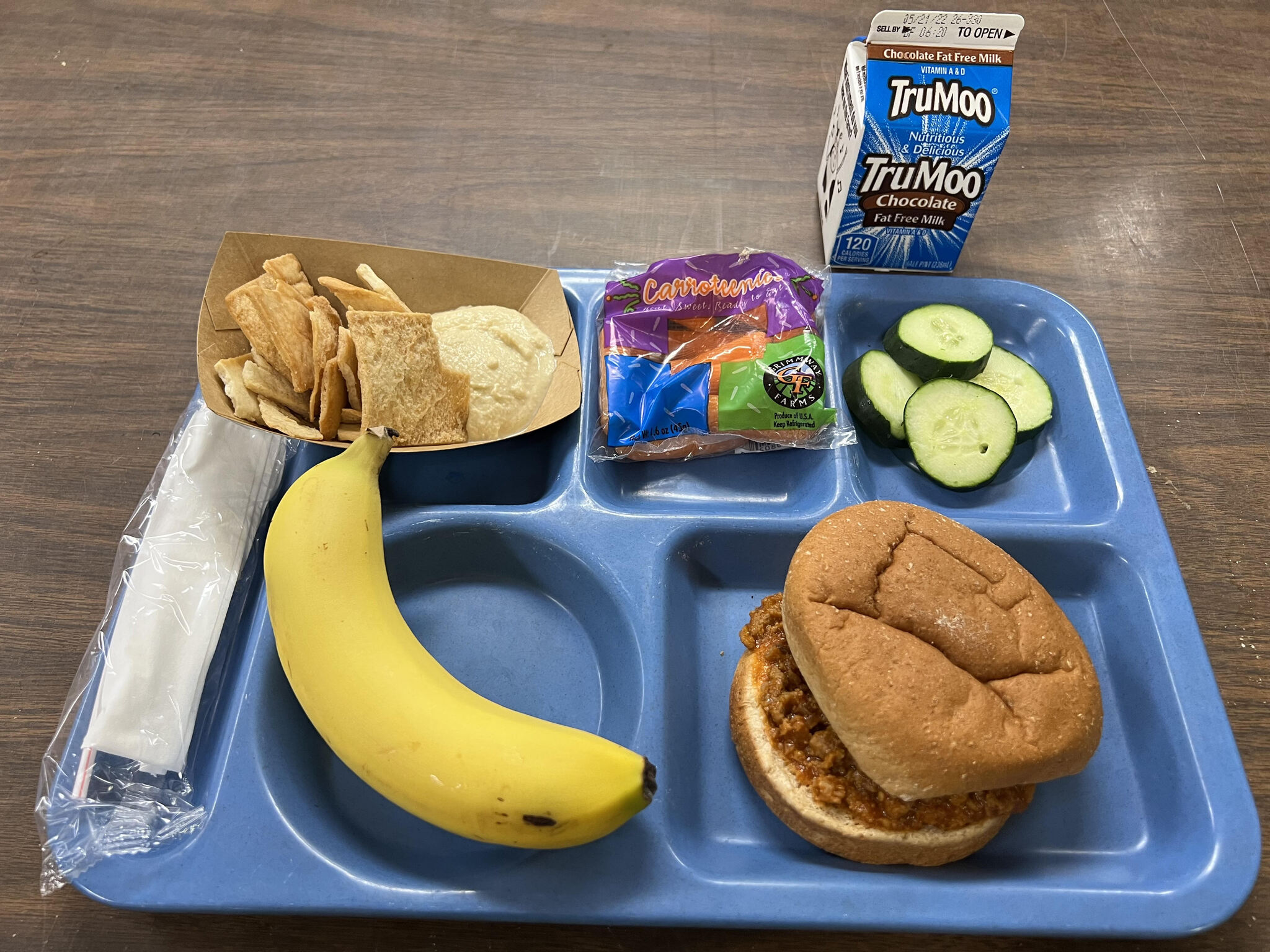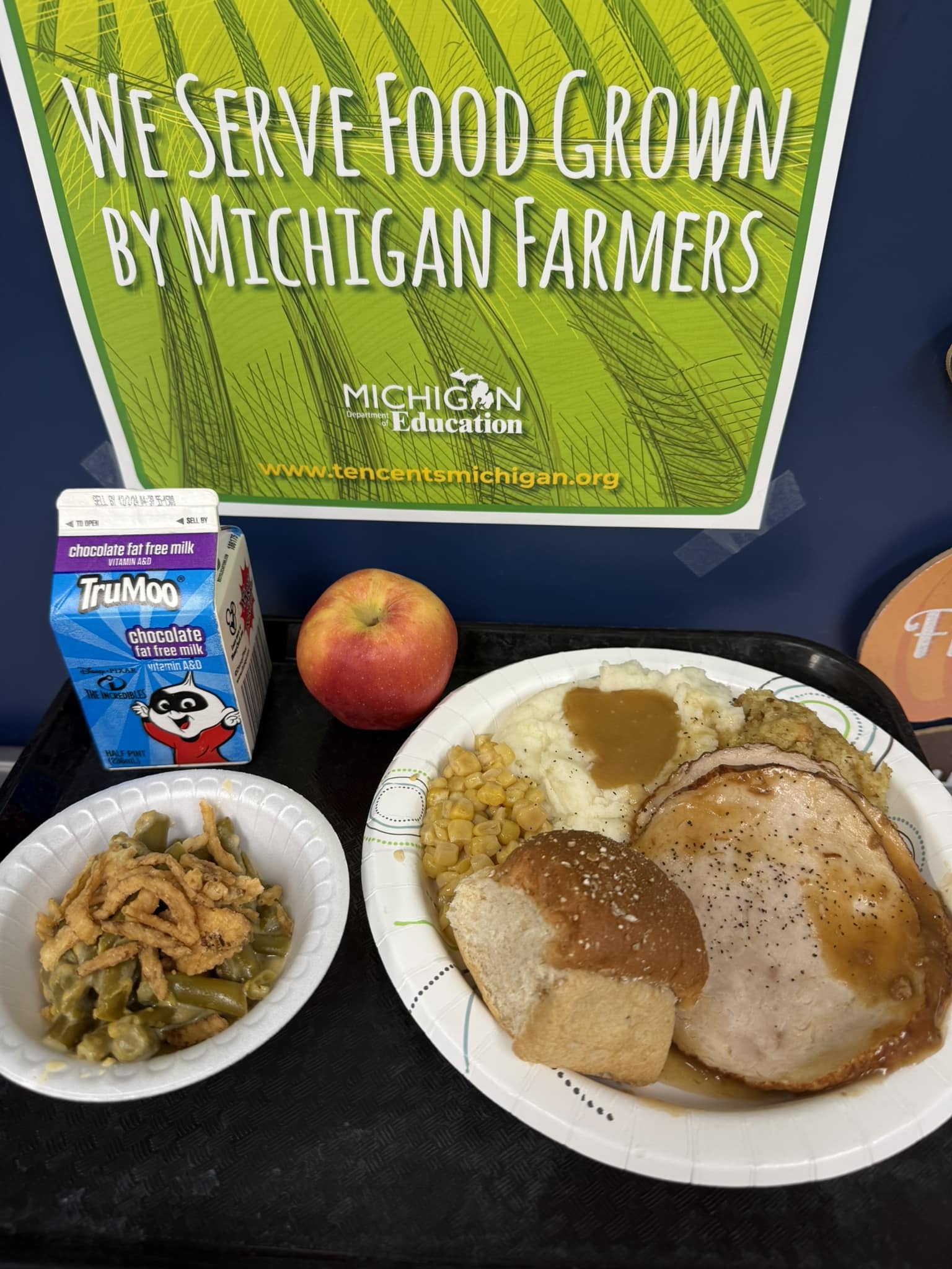 "Oriole" bowl with sweet and sour chicken, rice , veggies, sauce and an egg roll. Served with fruit, juice and milk. Good Lunch!!!