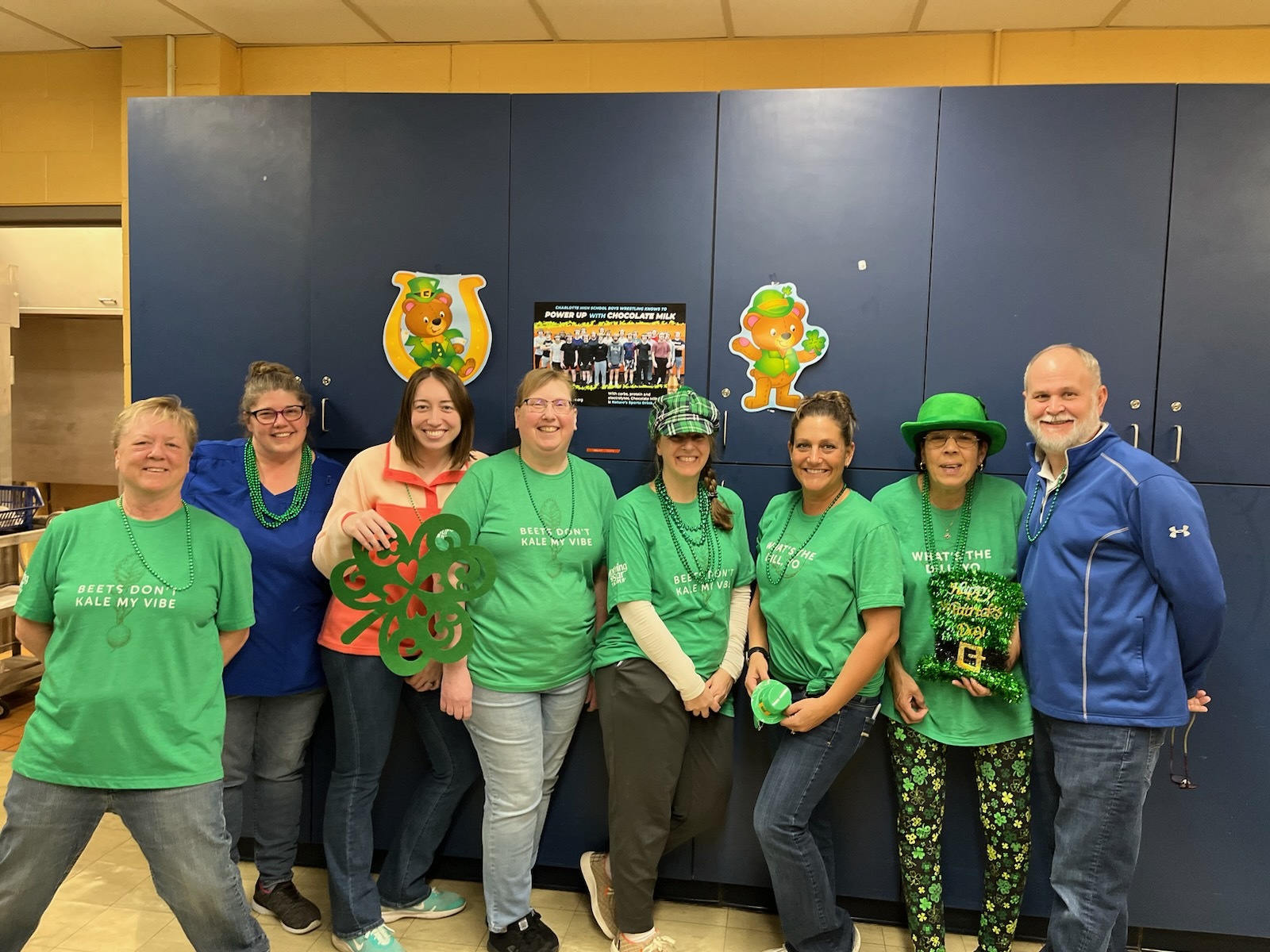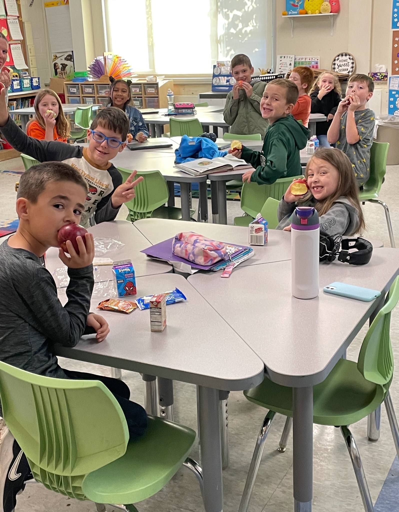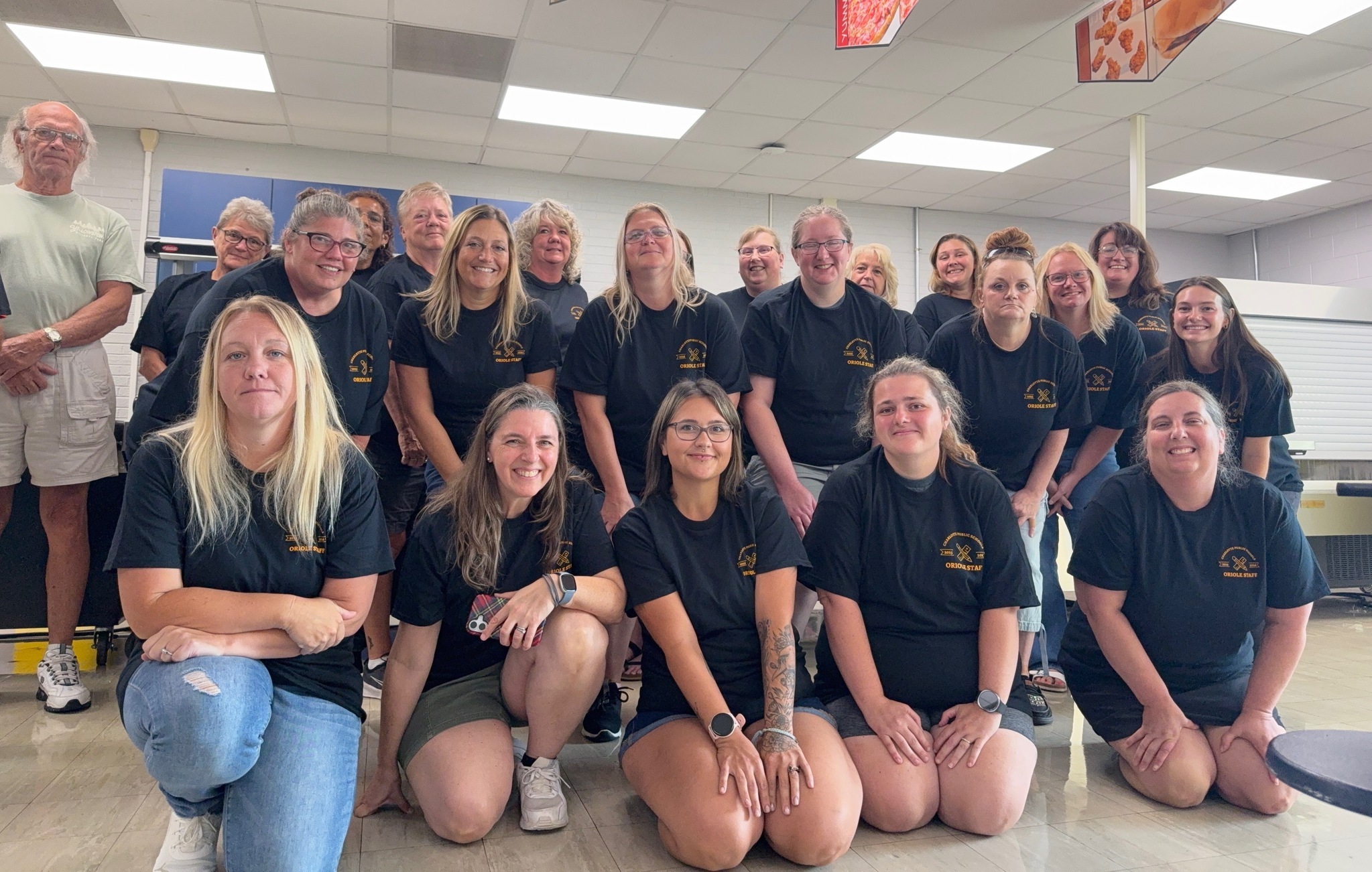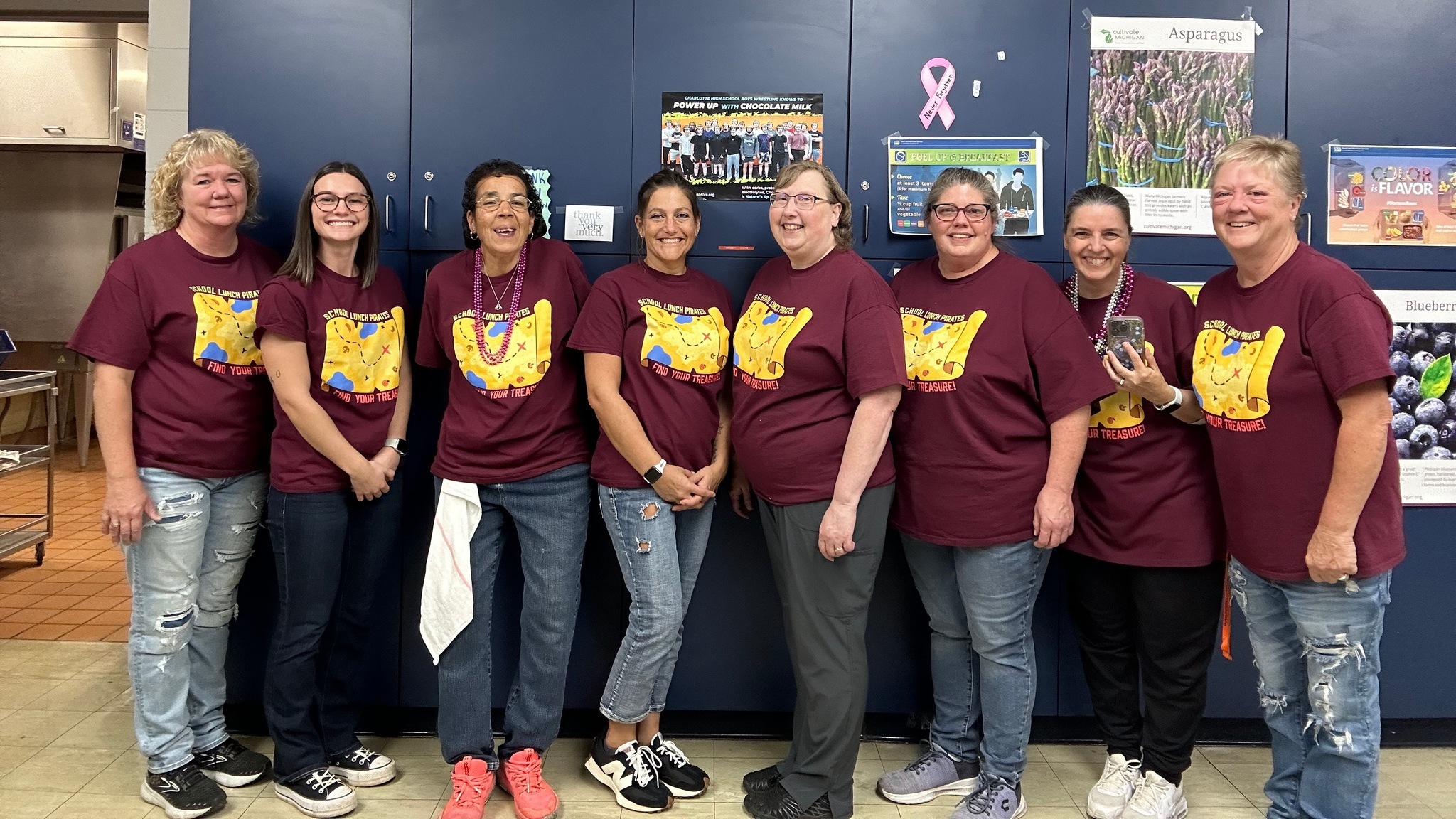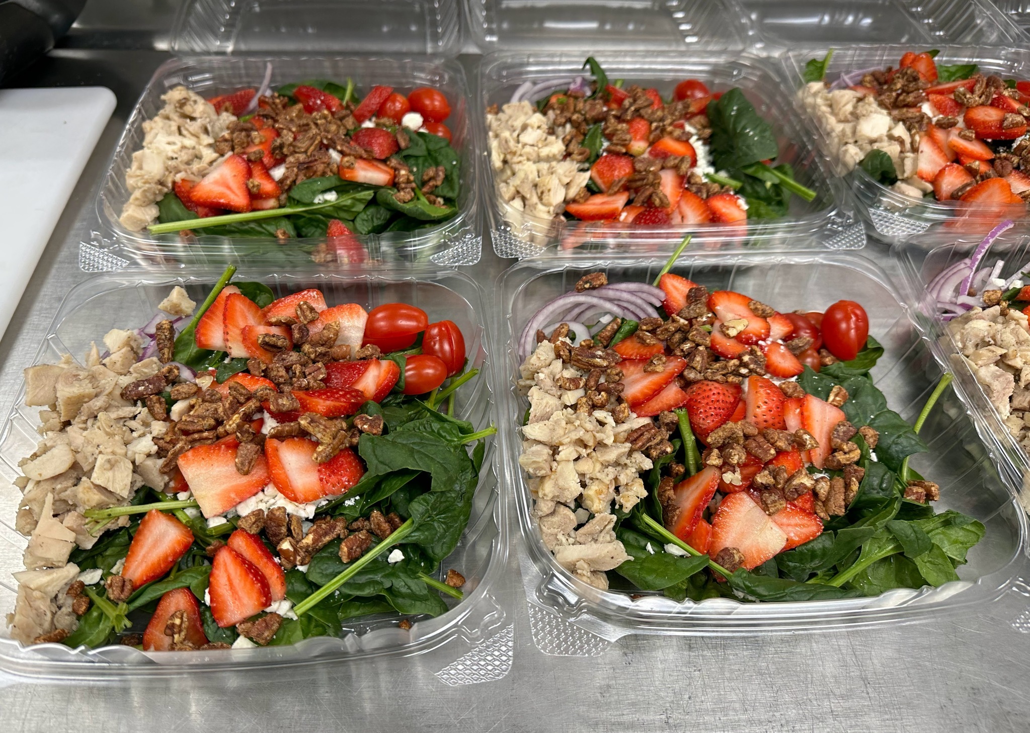 "Oriole" bowl with sweet and sour chicken, rice , veggies, sauce and an egg roll. Served with fruit, juice and milk. Good Lunch!!!